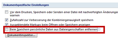 Entfernen Sie das Häkchen bei "Beim Speichern persönliche Daten aus Dateieigenschaften entfernen".