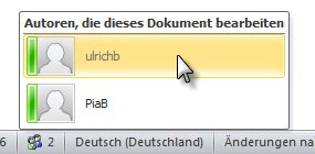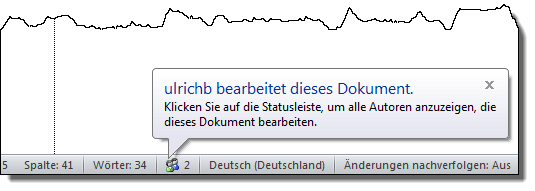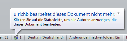 Nach einigen Sekunden erscheint in der Statusleiste das Symbol "x Autoren" - hier sind es zwei. Sobald ein neuer Bearbeiter dazu kommt, wird mit einem Popup der Name angezeigt. Später wird nur noch die Zahl neben den Köpfen gezeigt. Ein Klick auf das Symbol zeigt aber immer alle Bearbeiternamen an, die aktuell das Dokument geöffnet haben.