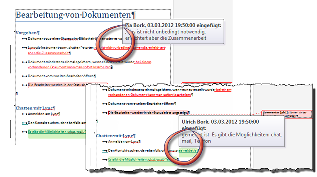 Arbeiten beide Bearbeiter im Änderungsmodus, sieht man die Bearbeiternamen sowie das Datum der Änderung direkt als Markups.