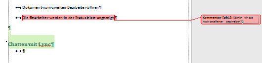 Ein Klick auf das Symbol an der Textstelle, die der andere bearbeitet, öffnet das Fenster für Mail, Chat und Telefon. Zum Chatten klicken Sie auf das Sprechblasen-Symbol. |