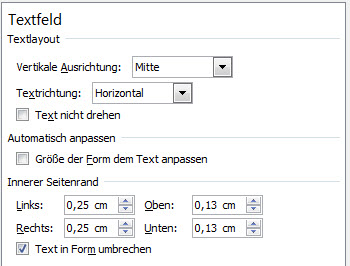 Die "Vertikale Ausrichtung" ist die Positionierung zwischen oberem und unterem Rand der Autoform; "Textrichtung" ist die Drehung des Textes in der Form. Der innere Seitenrand ist der Abstand zwischen Text und Rahmenlinie.