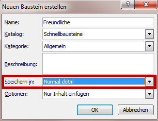 Für die Speicherung in der Normal.dotm kann der Baustein in den Katalog der Schnellbausteine angelegt werden.