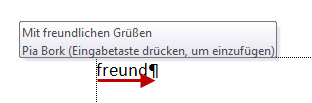 Jetzt reicht es, die ersten vier Buchstaben zu tippen. Sobald der Quicktipp erscheint, kann mit ENTER der gesamte Schnellbaustein abgerufen werden. | ![]() |