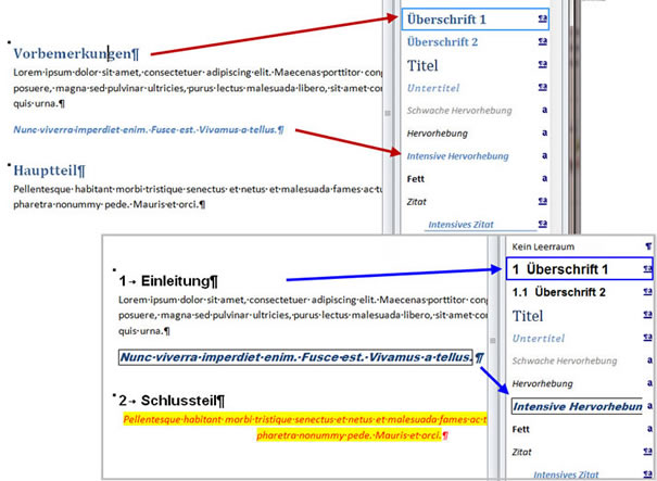 Der obere Text ist unverändertes Microsoft-Format. Im unteren Text wurden die Formatvorlagen für Überschriften geändert (Schriftart, -farbe und Nummerierung), die Formatvorlage "Intensive Hervorhebung" wurde angepasst und die Formatvorlage "Anmerkung" wurde neu hinzugefügt (das ist die Formatvorlage für den gelb unterlegten, zentrierten Text am Ende).
