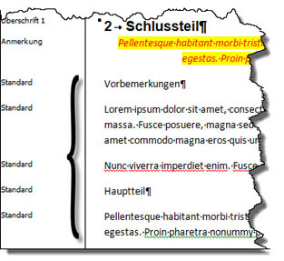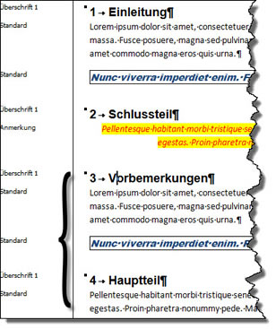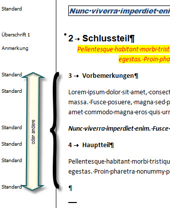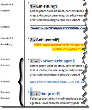 Der Text sieht in der Tat noch so aus wie vorher - aber: er ist komplett als Formatvorlage "Standard" formatiert! Die Nummerierung der Überschrift wird fortgesetzt, obwohl weder "Vorbemerkungen" noch "Hauptteil" als Überschriften formatiert sind.