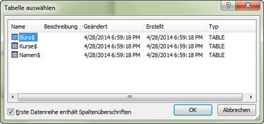 Hat die Excel-Arbeitsmappe mehrere Tabellenblätter, werden die aufgelistet, so wie Sie es von einem Seriendruck kennen. Achten Sie unten auf die Option "Erste Datenreihe enthält Spaltenüberschriften". |
