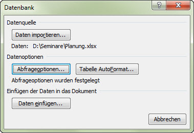 Als nächstes kommen die "Abfrageoptionen". Sie entsprechen den Abfrageoptionen eines normalen Seriendrucks. Damit können Sie Datensätze filtern, sortieren und die Tabelle auf bestimmte Felder beschränken. |