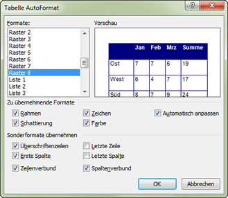 Mit "Tabelle AutoFormat" können Sie die Ausgabetabelle formatieren. Wählen Sie ein Format (wie z. B. Raster 8), wählen Sie aus, welche Formate und Sonderformate übernommen werden sollen. Das wird später im Schalter \b angezeigt.