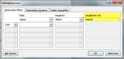 Tragen Sie auf dem Register "Datensätze filtern" den ersten Namen ein. Dieser Name wird später durch das Seriendruckfeld ersetzt.