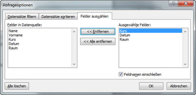 Wenn Sie nicht alle Felder aus der Ursprungstabelle verwenden wollen, können Sie die Felder auswählen. Markieren Sie sie rechts und klicken Sie auf "Entfernen".