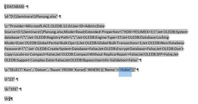 DATABASE kann über einen Assistenten aufgerufen und gefüllt werden. Sie können aber auch die notwendigen Argumente manuell eintragen (in Beispiel "Kursleiter, Kurse und Bürotage" zeige ich das).