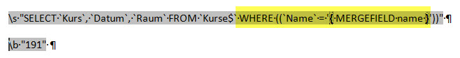 Jetzt müssen Sie noch zwei manuelle Änderung vornehmen, damit immer jeweils der aktuelle Referent als Datensatz verwendet wird. Anstelle des ersten Namens (bei mir blau unterlegt "Huber") muss das Seriendruckfeld eingefügt werden.