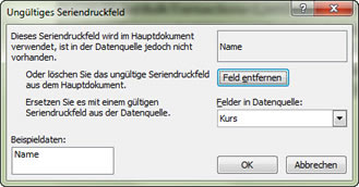 Die Fehlermeldung lautet "Ungültiges Seriendruckfeld" und ist unabhängig davon, ob Sie einen Seriendruck verwenden oder nicht. Es werden genau die Felder angemahnt, die Sie entfernt haben. Angeblich sind die Felder im Hauptdokument in Nutzung - was nicht korrekt ist.