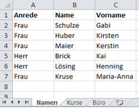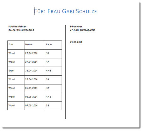 Die Aufgabenstellung ist, einen Serienbrief zu erstellen, in dem die Namen aus einer Datenquelle stammen und weitere Angaben aus zwei anderen Datenquellen. Für jeden Referenten aus der Tabelle "Namen" sollen die für ihn geltenden Kurse aus der Tabelle "Kurse" und die Bürotage aus der Tabelle "Büro" aufgelistet werden. Gemeinsam ist allen das Feld "Name" - und es ist sichergestellt, dass jeder Nachname eindeutig ist.