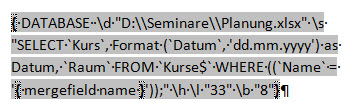 {DATABASE \d "D:\\Seminare\\Planung.xlsx" \s "SELECT `Kurs`, Format (`Datum`, 'dd.mm.yyyy') as Datum, `Raum` FROM `Kurse$` WHERE ((`Name` = '{mergefield name}'));" \h \l "33" \b "8"}