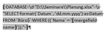{DATABASE \d "D:\\Seminare\\Planung.xlsx" \s "SELECT format (`Datum`, 'dd.mm.yyyy') as Datum FROM `Büro$` WHERE ((`Name` = '{mergefield name}'));" }