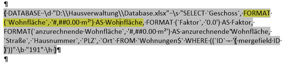 ... "SELECT 'Geschoss', FORMAT ('Wohnfläche', '#,##0.00 m²') AS Wohnfläche, FORMAT ('Faktor', '0.0') AS Faktor, FORMAT ('anzurechnende Wohnfläche', '#,##0.00 m²') AS anzurechnende Wohnfläche, 'Straße', 'Hausnummer', 'PLZ', 'Ort' ...