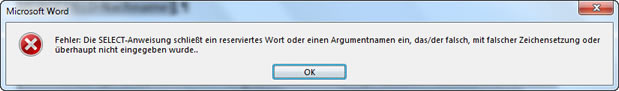 ACHTUNG! Sobald eine Überschrift aus mehreren Worten besteht - wie "anzurechnende Wohnfläche" - müssen Sie die Worte durch geschützte Leerzeichen mit STRG+Leerschritt trennen oder besser verbinden. Einfache Leerzeichen führt zu der Fehlermeldung "Die SELECT-Anweisungt schließt ein reserviertes Wort oder einen Arguemtnnamen ein, das/der falsch, mit falscher Zeichensetzung oder überhaupt nicht eingegeben wurde".