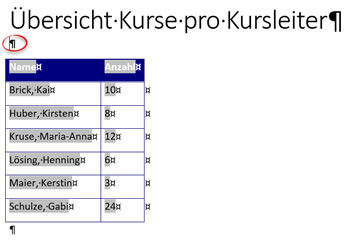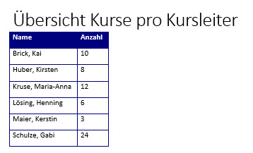 Es gibt eine Liste aller Kurse mit den Namen der Kursleiter, der Kursnummer, dem Datum und weiteren Angaben. Daraus soll in einem Wordbericht die Liste der Kursleiter entstehen, bei der jeder Name nur einmal auftaucht mit der Anzahl der Kurse daneben.