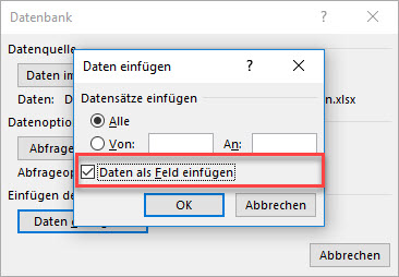 Klicken Sie auf "Daten einfügen" und aktivieren Sie unbedingt die Option "Daten als Feld einfügen"! Wenn Sie das vergessen, bekommen Sie nur eine Tabelle, die sich nicht mehr an die unterschiedlichen Kunden-Nummern anpasst! Mit OK bestätigen. |