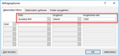 Klicken Sie auf "Abfrageoptionen" und wählen Sie als Feld "Kunden-Nr#", bei Vergleich steht "Gleich" und bei "Vergleichen mit" tragen Sie eine Zahl ein: 1234 oder 9999. ACHTUNG! Sie sollten wirklich eine Zahl, keinen Text verwenden. Bestätigen Sie mit OK. |