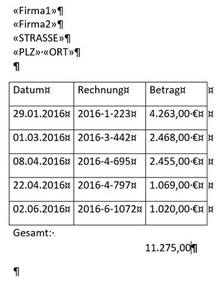 Mit einem Serienbrief sollen die offenen Rechnungen pro Kunde aufgelistet werden.