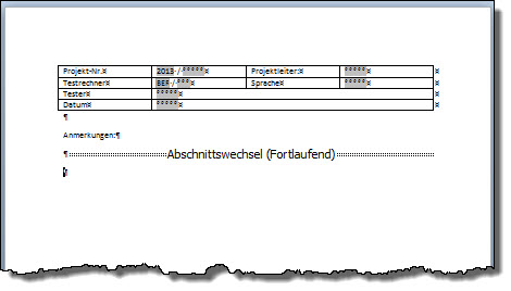 Darunter soll der Anwender in einem freien Bereich Anmerkungen schreiben können. Im Anschluss an den Formular fügen Sie mit "Seitenlayout / Umbrüche / Abschnittswechsel: Fortlaufend" einen Abschnittswechsel auf der Seite ein.