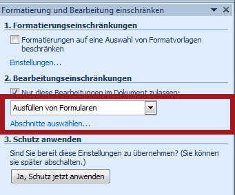 Wählen Sie "Datei / Informationen / Dokument schützen / Bearbeitung einschränken". Es öffnet sich am rechten Bildschirmrand der Aufgabenbereich "Formatierung und Bearbeitung einschränken".