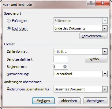 Die erste Einstellung ist die Platzierung der Endnoten: "Ende des Dokuments" ist Standard, alternativ gibt es "Abschnittsende". Das Zahlenformat kann sein: