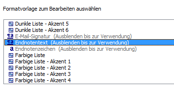 Endnotenzeichen sowie der Endnotentext werden mit Formatvorlagen formatiert. Beide werden nicht standardmäßig in der Liste der Formatvorlagen angezeigt.