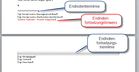 Es gibt noch die Endnoten-Fortsetzungstrennlinie, die immer seitenbreit ist sowie den Endnoten-Fortsetzungshinweis (hier in Rot). | |