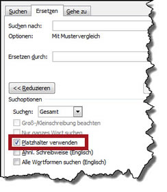 Klicken Sie auf "Start / Ersetzen". Klappen Sie mit Klick auf "Erweitern" die Optionen auf, machen Sie ein Häkchen bei "Platzhalter verwenden" |