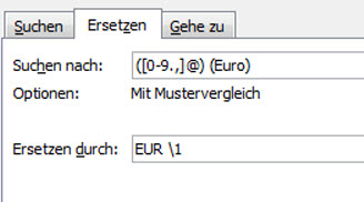 Tippen Sie in "Suchen nach" ein: ([0-9.,]@) (Euro) Tippen Sie bei "Ersetzen durch" ein: EUR \1 |