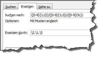 Beim Ersetzen werden die Ausdrücke getauscht. Zuerst kommt Ausdruck 2 (Tag), dann 1 (Monat) und dann das Jahr.