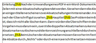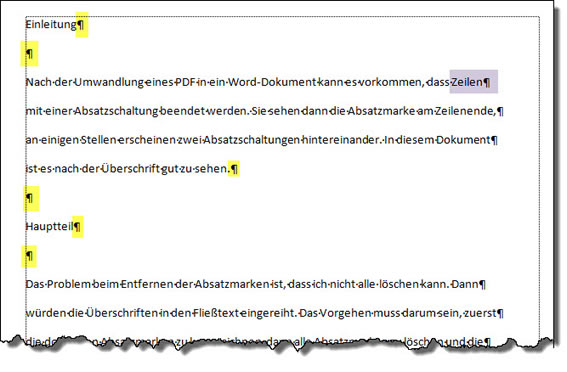 Im Beispiel unten sehen Sie gelb markiert die Stellen, die später mit einer Absatzmarke getrennt werden müssen - hier gilt: ersetze zwei Absatzmarken durch eine.