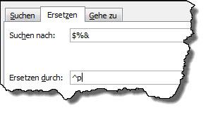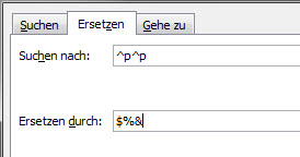 Vorsicht! Wählen Sie nicht "Absatzbuchstabe" - das sucht nach dem Sonderzeichen für den Absatz. Bei "Ersetzen durch" geben Sie eine Zeichenfolge ein, die garantiert nicht vorkommt - beispielsweise $%&