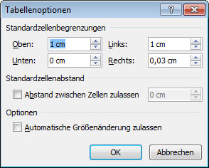 Stellen Sie den Cursor in eine der Tabellenzellen. Wählen Sie "Tabellentools / Layout / Eigenschaften". Auf dem Register "Tabelle" klicken Sie auf "Optionen". Tragen Sie für "Oben" und für "Links" jeweils 1 cm ein. Mit OK bestätigen. |