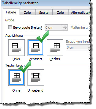 Im Dialog "Tabelleneigenschaften" stellen Sie bei "Ausrichtung" ein "Zentriert". Kontrollieren Sie, dass der Textumbruch "Ohne" ist. Mit OK bestätigen. Beim Ausdrucken bekommen Sie mit Sicherheit eine Meldung, dass die Ränder außerhalb des bedruckbaren Bereichs liegen - bestätigen Sie mit "Ja", dass Sie dennoch drucken wollen. Der Ausdruck ist dennoch korrekt. |