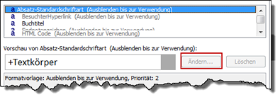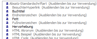 Rechts sehen Sie, dass "Buchtitel" oder "Endnotenzeichen" oder "Hervorhebung" unterhalb der Absatz-Standardschriftart stehen und von ihr abhängen. | ![]() |