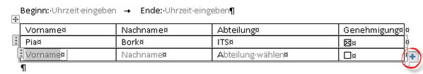 Ab Word 2013 gibt es das Inhaltssteuerelement für wiederholte Abschnitte. Ein sperriger Begriff. Gemeint ist die Möglichkeit, ein oder mehrere Steuerelemente zu wiederholen. Als Beispiel nehme ich eine Namensliste, deren Anzahl ich vorher nicht weiß. Für jeden Namen sollen Vor- und Nachname eingetragen werden, aus einer Dropdownliste wird die Abteilung gewählt und mit einem Kontrollkästchen soll gewählt werden, ob die Genehmigung bereits vorliegt.
