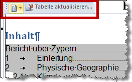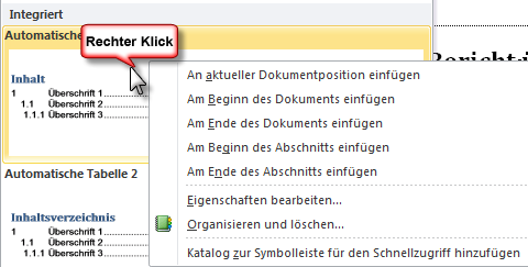 Sie können aber auch das Dokument am Dokumentanfang oder -ende einfügen, unabhängig wo Sie gerade stehen. Klicken Sie dazu mit der rechten Maustaste auf das Inhaltsverzeichnis.