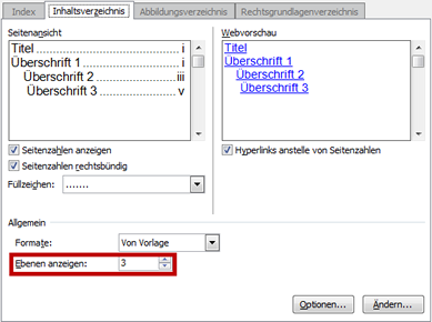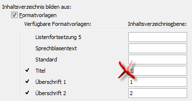 Alle Formatvorlagen, die im Inhaltsverzeichnis erscheinen habe eine Zahl für die Verzeichnisebene. Der "Titel" wird als Ebene 1 aufgeführt. Ich lösche die Ziffer heraus, vor "Titel" verschwindet das Häkchen. Alle geöffneten Dialoge mit "OK" bestätigen und die Abfrage, ob das vorhandene Verzeichnis ersetzt werden soll, ebenfalls mit "OK" bestätigen.