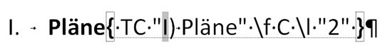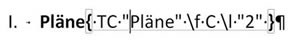 2) Die Verwendung der Punkte im Inhaltsverzeichnis wird mit dem TC-Feld gemacht: "Pläne" markieren, ALT+SHIFT+O drücken - wie hier schon beschrieben. Die Ebene soll "2" sein (Schalter \l "2"). |