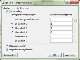 Das Inhaltsverzeichnis wird aufgebaut mit den Formatvorlagen Überschrift 1 bis 3 plus den Verzeichniseintragsfeldern.