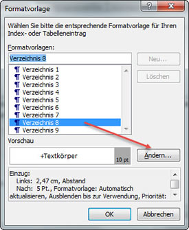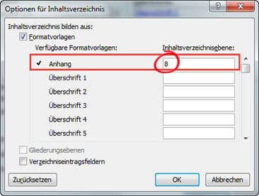 Das zweite Inhaltsverzeichnis braucht den Tabulatorsprung im Verzeichnis, basiert auf der Formatvorlage "Anhang" und soll separat erstellt werden. Verwendet wird die Formatvorlage "Verzeichnis 8" und eventuell "Verzeichnis 9", falls die Anhänge noch Unterpunkte haben.