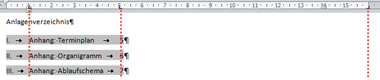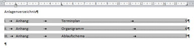 Das Inhaltsverzeichnis sieht jetzt so aus, wie rechts zu sehen: noch wird der Tabulator zwischen "Anhang:" und folgendem Text nicht verwendet.