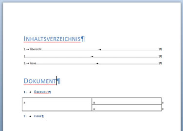Das Dokument ist überschaubar: ein Inhaltsverzeichnis (ebenfalls mit einer Geisterüberschrift), einer Überschrift, einer Tabelle und einer zweiten Überschrift. Danach ist Schluss.