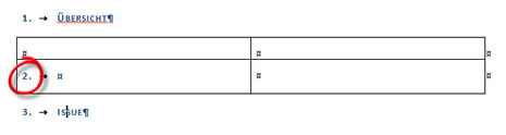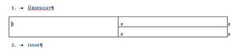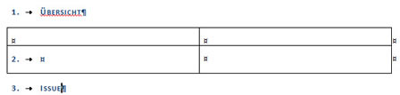 Sie sehen links zuerst die tatsächlich vorhandene Überschrift "1. Überschrift", gefolgt von einer leeren "1. " und dann wieder die tatsächlich vorhandene Überschrift "2. Issue".