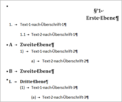 So ähnlich könnte die Kombination aussehen. Die erste Ebene der Überschriften (§ 1) ist zentriert, es folgen zwei nummerierte Textebenen (1. und 1.1).
