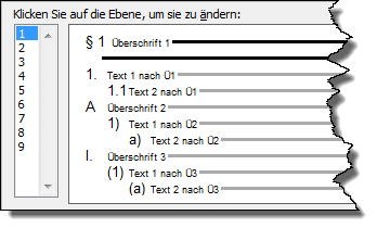 Sie haben maximal neun Ebenen, die Sie vergeben können. Es geht also nicht, dass Sie alle neun Überschriftsebenen plus jeweils mehrere nummerierte Textebenen erstellen. Ich habe mich entschieden, drei Überschriftsebenen zu verwenden und für jede zwei nummerierte Textebenen zu erzeugen.